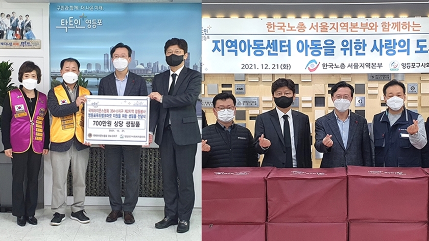 영등포구사회복지협의회(아래 사회복지협의회)에 따르면 12월 21일 국제라이온스협회 354-D지구 제2 지역에서 사회복지협의회에 영등포구 푸드뱅크마켓 이용자들을 위해 700만원 상당의 생필품을 기부했다. 이날 영등포구청장실에서 전달한 후원품은 푸드뱅크마켓 3개소에 배치 진열되어 이용자들에게 전달될 예정이다. 또한 21일 한국노총 서울지역본부에서도 영등포구 저소득 취약계층 자녀들(지역아동센터)에게 300만원 상당의 도시락 300개를 후원했다. 후원품은 이날 영등포구 지역아동센터 18개소에 즉시 전달되었다.