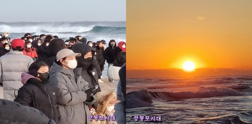 강능 사천해변을 찾은 시민들이 솟아오르는 태양을 보며 소원을 빌고 있다.