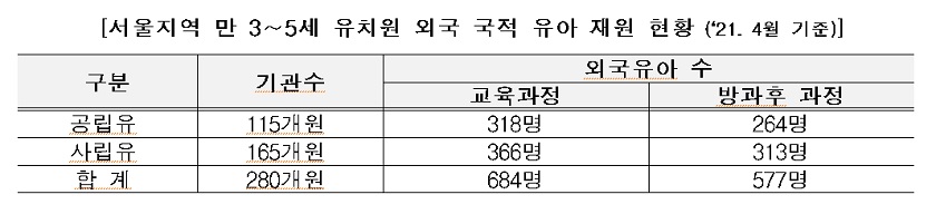 이 사업은 '22년 서울특별시교육청 본예산에 편성된 18.7억 원 예산 규모로 추진한다. 지원대상은 서울지역 공·사립 유치원에 다니면서 국내에 외국인(거소) 등록이 완료된 외국 국적의 만3~5세 유아이며, 지원금액은 국내 유아와 같은 공립 월 15만원(교육과정 10만원, 방과 후 과정 5만원), 사립 월 35만원(교육과정 28만원, 방과 후 과정 7만원)이다.