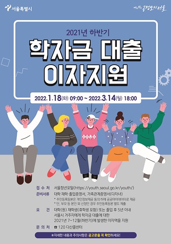서울시가 한국장학재단에서 학자금 대출을 받은 사람 중 서울 거주 국내 대학(원) 재학생•휴학생, 졸업 후 5년 이내 서울 거주자를 대상으로 학자금 대출 이자를 지원한다고 1월 18일 오전 밝혔다. 2021년 하반기(7~12월)에 발생한 학자금 대출에 관한 지원이다.