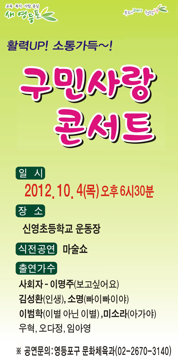 구는 오는 4일 오후 6시 30분 부터 신영초등학교 운동장에서 '활력UP! 소통가득~! 구민사랑 콘서트'를 개최한다고 밝혔다. 식전 공연으로는 마술쇼가 펼쳐지며 우리들에게 친숙한 가수들이 대거 출연해 구민들과 함께 한다.