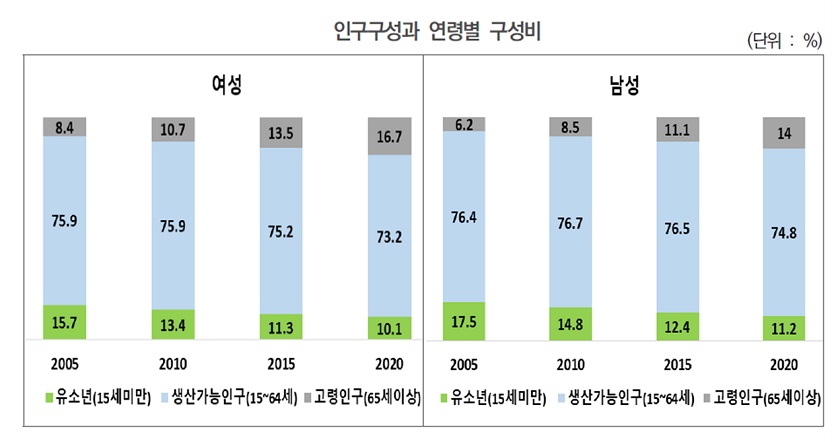 2021년 2/4분기 서울시 주민등록인구는 약 979만 명으로, 그중에서 여성이 51.4%(약503만 9천 명)를 차지해 남성 48.6%(약 475만 6천 명)보다 2.8%p 더 높은 것으로 나타났다. 서울시가 서울에 거주하는 여성과 남성의 생활실태를 종합적으로 파악하기 위해 ‘2021년 서울시 성인지 통계:통계로 보는 서울 여성’을 발간하고, 주요 내용을 3일(목) 발표했다. 발표 내용에 따르면 연령별로는 여성, 남성 모두 유소년(0~14세) 인구비율은 줄고, 고령인구(65세 이상)는 대폭 증가하는 특징을 보였다. 유소년 인구비율의 경우 여성은 2005년 15.7%→2020년 10.1%로, 남성은 2005년 17.5%→2020년 11.2%로 줄었다. 반면 고령인구는 같은 기간 여성은 8.4%→16.7%로, 남성은 6.2%→14%로 2배 이상 늘었다.
