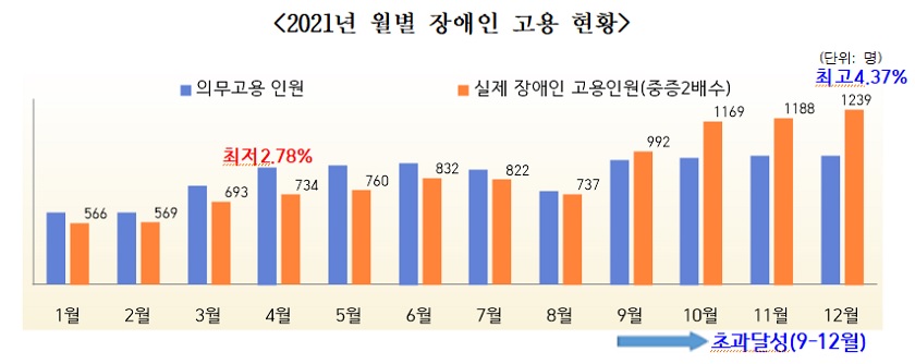 2021년도는 코로나19 대응을 위한 방역 인력 등 상시근로자가 대폭 늘어나는 등 불리한 환경이었지만, 상시근로자 증가율 전년과 비교하면 약 18%를 상회하는 장애인 채용으로 법정의무 고용률(3.4%)을 큰 폭으로 초과 달성했다는 점에서 이번 성과는 의미가 크다는 평가다.
