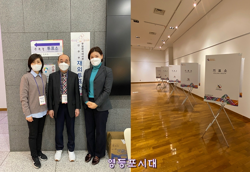일본 신주쿠에 거주하는 김난영 씨 가족은 2월 27일 오후 신주쿠 주일한국대사관에 설치된 재외투표소에서 투표를 마친 뒤 28일 본지에 인증 샷을 보내왔다. 김난영 씨 가족이 재외국민 부재자 투표 인증 샷을 보내온 것은 2020년4월 제21대 총선에 이어 두 번째다.