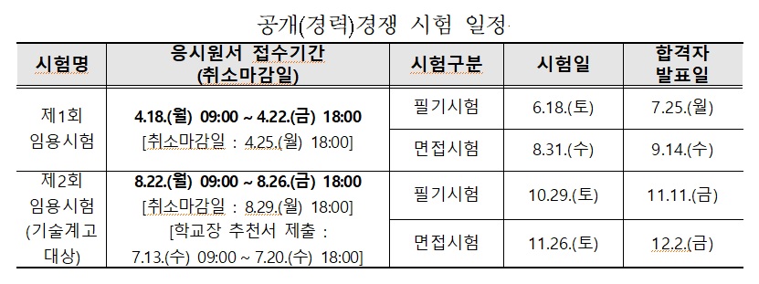 필기시험 합격자는 7월 25일 발표되며 면접시험은 8월 31일 시행되고 합격자는 9월 14일 발표할 예정이다. 제2회 임용시험(기술계고 대상) 응시원서 접수는 8월 22일 09:00부터 8월 26일 18:00까지 하면 된다. 필기시험은 10월 29일 전국에서 동시에 시행되며 합격자 발표는 11월 11일이다. 면접시험은 11월 26일 시행되고 합격자는 12월 2일 발표할 예정이다. 올해 신규 공무원 채용인원은 ▲ 공개경쟁 296명 ▲ 경력경쟁 73명이다. 분야별로 ▲행정직군 269명(교육행정 234명ㆍ전산 14명ㆍ사서 21명), ▲기술직군 100명(공업 9명ㆍ시설 14명ㆍ보건 7명ㆍ시설관리 70명)이다. 상반기에 실시되는 공개 (경력)경쟁 임용시험 선발 규모는 총 346명이고, 행정직군 269명, 기술직군 77명을 선발할 예정이다.