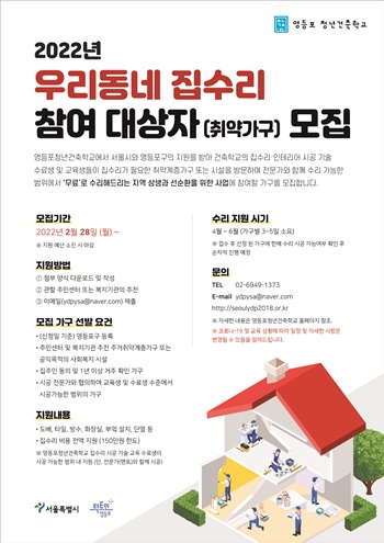 영등포구가 건축 분야 전문가를 꿈꾸는 청년들에게 현장 실무 경험을 쌓을 기회를 제공하기 위해 ‘우리동네 집수리 지원 사업’을 추진한다고 3월 15일 밝혔다. 영등포청년건축학교(아래 청년건축학교) 참여 교육생과 멘토 전문가가 함께 실습에 쓰이는 재료·장비·도구를 활용해 지역사회 공헌을 실천하는 ‘우리동네 집수리 지원 사업’을 추진한다. ‘우리동네 집수리 지원 사업’은 청년을 대상으로 건축 전문 기술을 교육하고, 실습을 겸해 지역 내 주거 취약계층의 집수리를 지원하는 사업으로 청년 취·창업 역량 강화와 지역 내 주거환경 개선에 앞장서 왔다. 지난해에는 집수리 교육과정을 수료한 청년들이 뜻을 모아 ‘뚝딱 수리 협동조합’을 설립, 지역의 주거 관련 문제를 해결하기 위해 다양한 활동을 펼치고 있다. 올해도 청년건축학교의 집수리·인테리어 교육과정에 참여 중인 교육생들이 전문가와 함께 주거 취약계층을 위한 맞춤형 집수리에 나선다. 동 주민센터 및 복지 기관의 추천을 통해 집수리 지원 대상을 모집하고 있으며, 신청일 기준 영등포구 거주 또는 등록된 주거 취약계층, 공익목적의 사회복지 시설이 선발 대상이다. 예산 소진 시까지 대상을 모집하고 오는 4월부터 수리 지원에 나설 계획이다. 도배, 타일, 방수, 화장실 및 부엌 설치, 단열 등 집수리 시공 기술 교육 수료생이 시공 가능한 범위 내에서 멘토인 전문가와 함께 시공한다. 최대 150만 원까지 집수리 비용을 전액 지원한다. 자세한 내용은 영등포청년건축학교 홈페이지를 참고하거나 영등포구청 사회적경제과(2670-1665), 영등포청년건축학교(6949-1373)로 문의하면 된다.