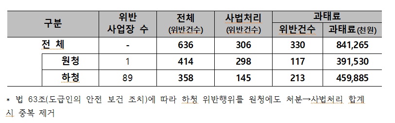 이번 감독은 현장별로 10명 이상의 감독 반을 구성하여, 안전조치 준수 여부를 중심으로 5일 이상 시행해 총 636건의 위반사항을 적발했다. 이 중 306건은 사법 조치하고 330건에 대해서는 과태료 약 8억 4천만원을 부과했다. 또한, 본사 최고경영자가 중심이 되어 현장에서 실제로 작동되는 안전보건관리체계를 구축·이행하는데 참고하도록 감독 결과를 본사에 통보했다.