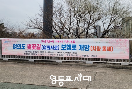 영등포구 여의서로 벚꽃길이 3년 만에 제한적으로 개방된다. 다만 지정된 시간 만 보행할 수 있다.