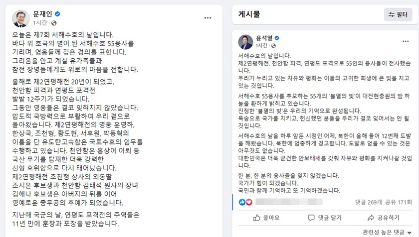 윤석열 당선인 역시 25일 오전 페이스북에 “제2연평해전, 천안함 피격, 연평도 포격으로 55인의 용사들이 전사했다”라며 “우리가 누리고 있는 자유와 평화는 이들의 고귀한 희생에 큰 빚을 지고 있다”라고 기렸다.