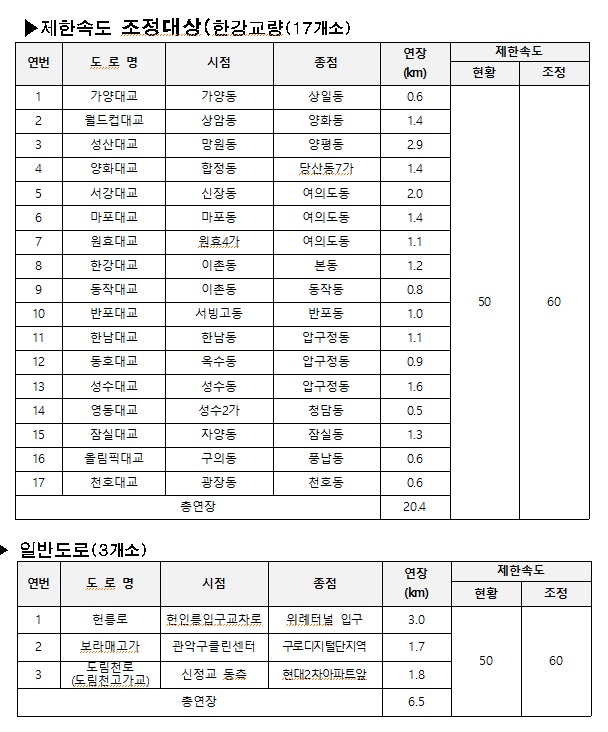 이로 인해 시민들이 불편을 호소하며 일부 도로구간에 제한속도 상향해야 한다는 요구가 끊이지 않고 이어져 왔다. 이에 서울시가 서울 전역 주요 도로의 제한속도를 최고 시속 50km로 일괄 적용하는 ‘안전속도 5030’을 시민들의 요구를 반영해 탄력적으로 운영한다. 제한속도 조정 대상 구간은 총 20개소로 양화대교 당산동7가에서 합정동((1.4km), 성산대교 양평동에서 망원동(29km) 등 한강 교량 17개 구간과 도림천로(도림천 고가교) 신정교 동측에서 현대2차아파트 앞까지(1.8km)를 포함해 일반도로 3개소 등 총 26.9km다. 서울시는 서울경찰청과 협의를 거쳐 보행자가 많지 않고 차량 소통이 비교적 원활한 한강 교량 등 20개 구간의 기존 제한속도를 시속 50km에서 60km로 상향한다고 3월 28일 밝혔다. 보도가 없어 보행자가 접근하기 어렵거나 밀도가 낮아 속도를 상향해도 안전사고 위험이 낮고, 차량 소통이 비교적 원활해 속도를 상향할 필요가 있는 구간이다. 교통안전표지, 노면표시 등의 교통안전시설 설치공사를 3월 말부터 시작해 4월 중순까지 마무리하고, 공사가 마무리되는 구간부터 바로 제한속도 상향이 적용된다. 다만, 한강 교량 중 자동차전용도로인 청담대교(제한속도 시속 80km)와 잠수교, 광진교, 잠실철교 측도 등 시속 40km 이하인 교량만 제한속도 조정 대상에서 제외돼 기존의 제한속도가 유지된다. 서울시는 작년 10월 ‘안전속도 5030’에 대한 시민 의견을 조사한 결과 약 70%의 일반시민, 운전자 모두 정책을 시행하는 것에 대해서는 공감을 했지만 약 90%의 시민이 일부 구간엔 속도조정이 필요하다는 의견을 제시했다.