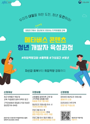 이에 영등포구가 4차 산업 시대를 이끌어갈 인재를 육성하고 청년 취․창업을 지원하기 위해 메타버스 콘텐츠 기획개발자 교육과정을 운영한다고 3월 30일 오전 밝혔다. 지역 내 전문교육기관과 협약을 맺고 4월부터 11월까지 운영할 예정인 이번 교육은 고용노동부에서 주관하는 2022 청년 도전 지원사업의 하나로 공모사업에 선정되어 운영한다. 지역 청년들을 대상으로 맞춤형 직무교육을 제공해 디지털 신기술 분야의 실무 역량을 강화하고 성공적인 취․창업을 지원하기 위해 ▲메타버스 플랫폼 활용 가상공간 디자인 ▲VR 360° 영상 촬영 및 콘텐츠 제작법 등을 배울 수 있으며 구직 활동에 도움이 되는 ▲건강·심리 상담 및 컨설팅 ▲현직자 멘토링 프로그램 등으로 운영된다. 교육 대상은 만 18~34세 구직단념 청년, 자립준비 청년, 청소년쉼터 입·퇴소 청년 등이다. 매월 25명씩 총 8기로 운영되며, 교육비는 전액 무료이다. 국비 지원을 통해 교육 커리큘럼 40시간 이상 이수시 1인당 20만 원을 지급한다. 4월 18일부터 30일까지 진행되는 1기 참가자는 오는 4월 17일까지 선착순 25명을 모집한다. 참여를 희망하는 청년은 영등포구 청년 온라인플랫폼에 게시된 구글폼으로 온라인 신청하거나 교육 운영 기관인 (사)한국디지털컨버전스협회에 방문 신청하면 된다.