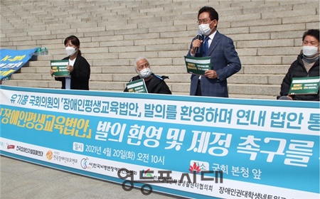 유기홍 위원장은 2021년 4월 장애인의 날을 맞아 전국장애인차별철폐연대, 전국장애인부모연대, 한국장애인자립생활센터협의회, 전국장애인야학협의회 등과 협의하여 ‘장애인평생교육법안’을 대표 발의한 바 있다. 유기홍 위원장은 “그 후 대통령선거 시기 이재명 후보는 물론 윤석열 후보도 긍정검토를 약속했지만 ‘장애인평생교육법안’은 국민의힘의 비협조로 상임위에서 논의조차 이뤄지지 못하고 있다”라고 지적하고 “평생교육이 취업과 직접적으로 연계되는 비율이 높아 장애인의 삶의 질 향상을 위해 평생교육이 필수적이다”라고 강조했다. 실제로 전국 장애인 250만여 명 중 55.7%가 중졸 이하의 학력을 가지고 있고, 대학 이상 학력자는 14.4%에 불과할 정도로 장애인과 비장애인의 교육격차가 심각하다. 그런데도 현재 진행되고 있는 평생교육 프로그램은 다양성 부족, 비장애인 중심, 관리 소홀 등으로 인해 장애인의 참여율이 4%에 불과하다. 이는 전체 성인의 평생교육 참여율 44.5%의 10분의 1에도 못 미치는 수준이다. 유기홍 위원장은 “장애인에게 평생교육은 선택이 아닌 필수이다”라며 “장애인의 자립능력을 키워주고 사회 참여를 촉진하기 위해서는 장애인만을 위한 평생교육법안을 제정해 통합적이고 체계적인 운영 체제를 구축해야 한다”라고 거듭 강조했다. 유기홍 위원장은 ““장애인에게 교육은 생명이다, 장애인에게 교육은 권리다”라며 “여·야 국회의원들이 함께 발의하고 대선 시기 여야 후보들이 공감한 ‘장애인평생교육법안’은 신속 통과되어야 한다”라며 빠른 통과를 촉구했다.