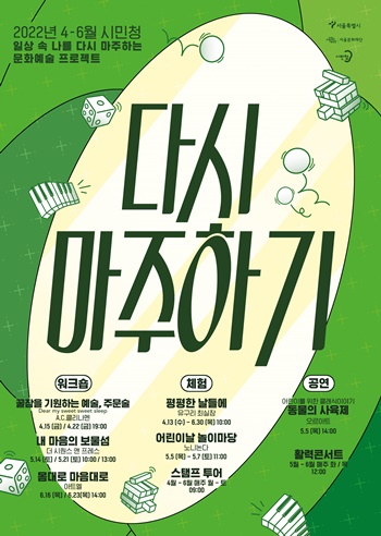 누구나 무료로 즐길 수 있는 시민청 문화예술 프로젝트 ‘다시 마주하기’는 코로나19의 여파로 챙기지 못했던 일상을 살피고 다시 만나고 싶은 일상을 공유하며 마주보자는 주제로, 워크숍, 체험, 공연 등 누구나 일상에서 부담 없이 참여할 수 있다. 시민의 일상을 회복하고 거리두기로 멀어진 서로 간의 소통과 안녕을 도모하고자 기획된 이번 프로젝트는 다채로운 문화예술 프로그램을 선보인다. 프로젝트는 시즌마다 시민들이 공감하는 주제로 프로그램을 확장해 나갈 예정이다. 4~6월은 ‘나 자신으로부터’, 7~9월은 ‘주변으로부터’, 10~12월은 ‘우리 모두로부터’까지로 선보인다. 주요 프로그램으로는 스스로 자신의 몸과 마음에 집중해볼 수 있는 ‘평평한 날들에(체험)’, ‘꿀잠을 기원하는 예술, 주문술(워크숍)’과 가족과 함께 참여하며 유대감을 나눌 수 있는 ‘내 마음의 보물섬(워크숍)’, ‘몸대로 마음대로(워크숍)’ 등으로 시민에게 일상을 회복할 힘과 봄의 따뜻한 기운을 선사할 예정이다. 봄의 나른한 일상에 새로운 활기를 불어넣는 <활력콘서트>도 선보인다. 공연예술에 열정을 지닌 시민으로 구성된 ‘시민청 예술가’가 선보이는 정기공연으로 매주 화요일과 목요일 정오마다 시민청 활짝라운지에서 만날 수 있다. 특히 5월 5일(목)에는 어린이날 100주년을 기념해 어린이를 위한 특별 공연 ‘어린이를 위한 클래식 이야기 <동물의 사육제>’와 ‘어린이날 놀이마당’이 펼쳐진다.