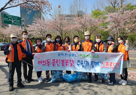 11일 오전, 여의동 자원봉사연합회 회원 12명이 여의나루역에 모여 계획을 공유하고 첫 번째 스프링깅 활동을 시작했다. 이어서, 오후에는 주민자치회 회원 10명이 참여해 깨끗한 봄꽃 길 만들기에 일손을 보탰다. 스프링깅은 봄을 뜻하는 스프링(spring)과 가볍게 산책이나 조깅을 하면서 쓰레기를 줍는 활동인 플로깅(plogging)을 합성해 만든 신조어로 봄꽃길을 걸으며 거리에 버려진 쓰레기를 줍는 봉사활동을 말한다. 회원들은 대로변, 아파트 골목길 사이사이를 지나며 노상에 방치된 쓰레기를 줍고 지역 주민과 행인들에게 쓰레기 무단투기 금지, 개인위생 철저함을 요구하는 질서유지 캠페인도 함께 진행했다. 스프링깅 활동은 오는 15일까지 여의나루역을 시작으로 여의도 중‧고등학교를 지나 천주교 여의도 성당, 63스퀘어, 가톨릭대학교 여의도 성모병원, 샛강역을 거쳐 윤중초‧중학교를 잇는 약 3km 구간의 동여의도 봄꽃 길 일대를 대상으로 실시될 예정이다. 활동에 참여한 회원 중 한 명은 “벚꽃길이 열리며 사람들이 여의도로 많이 몰려들고 있어 쓰레기 문제와 방역에 대해 걱정이 되었는데 이렇게 직접 현장에 나서 청소하니 마음의 걱정도 덜고 봄바람까지 느낄 수 있어 더욱 상쾌한 기분이다”라는 소감을 전했다.