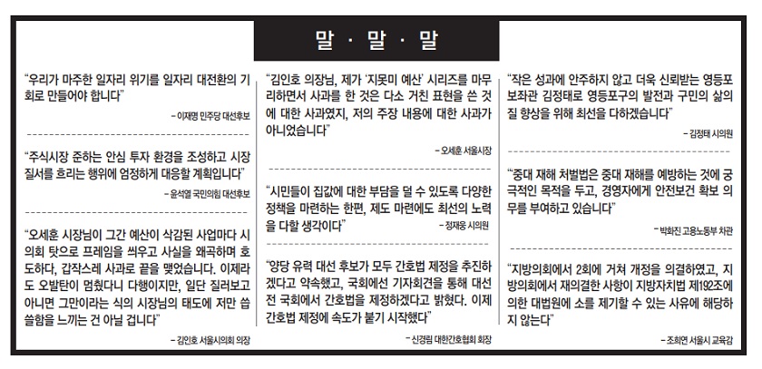 “우리가 마주한 일자리 위기를 일자리 대전환의 기회로 만들어야 합니다” -이재명 민주당 대선 후보 “주식시장 준하는 안심 투자 환경을 조성하고 시장 질서를 흐리는 행위에 엄정하게 대응할 계획입니다” -윤석열 국민의힘 대선 후보 “오세훈 시장님이 그간 예산이 삭감된 사업마다 시의회 탓으로 프레임을 씌우고 사실을 왜곡하며 호도하다, 갑작스레 사과로 끝을 맺었습니다. 이제라도 오발탄이 멈췄다니 다행이지만, 일단 질러보고 아니면 그만이라는 식의 시장님의 태도에 저만 씁쓸함을 느끼는 건 아닐 겁니다” -김인호 서울시의회 의장 “김인호 의장님, 제가 ‘지못미 예산’ 시리즈를 마무리하면서 사과를 한 것은 다소 거친 표현을 쓴 것에 대한 사과였지, 저의 주장 내용에 대한 사과가 아니었습니다” -오세훈 서울시장 “시민들이 집값에 대한 부담을 덜 수 있도록 다양한 정책을 마련하는 한편, 제도 마련에도 최선의 노력을 다할 생각이다” -정재웅 시의원 “작은 성과에 안주하지 않고 더욱 신뢰받는 영등포 보좌관 김정태로 영등포구의 발전과 구민의 삶의 질 향상을 위해 최선을 다하겠습니다” -김정태 시의원 “중대 재해 처벌법은 중대 재해를 예방하는 것에 궁극적인 목적을 두고, 경영자에게 안전보건 확보 의무를 부여하고 있습니다” -박화진 고용노동부 차관 “양당 유력 대선 후보가 모두 간호법 제정을 추진하겠다고 약속했고, 국회에선 기자회견을 통해 대선 전 국회에서 간호법을 제정하겠다고 밝혔다. 이제 간호법 제정에 속도가 붙기 시작했다” -신경림 대한간호협회 회장 “각종 지원금 신청을 전화 또는 문자메시지를 통해 받지 않으며 신분증 등 개인정보도 요구하지 않음에 따라, 이를 요구하는 행위에 응하지 말아야 합니다” -정부 관계자 “지방의회에서 2회에 거쳐 개정을 의결하였고, 지방의회에서 재의결한 사항이 지방자치법 제192조에 의한 대법원에 소를 제기할 수 있는 사유에 해당하지 않는다” -조희연 서울시 교육감 “최근에는 20대, 30대 젊은 층에서도 통풍 환자가 늘고 있다. 서구식 식습관과 비만, 음주 등이 원인이다” -조동후 영등포병원 내과 2과장 “제 몸을 태워 행복을 준 하얀 연탄의 무게만큼 삶의 무게가 가벼워지기를 바라며 피폐해진 삶 속에서 하루하루를 힘들게 버티고 있는 많은 사람을 위해 희망과 온기를 전해주는 자비명상 마가 님과 ‘자비나눔공덕회’ 봉사자들께 거듭 감사의 마음을 전합니다” 김부용(자원봉사자) 152호 말말말(22년 1월 22일 발행/배포)