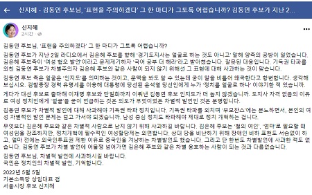 김동연 후보는 5월 2일 한 라디오에 출연해 김은혜 후보를 향해 “경기도지사는 얼굴로 하는 것도 아니고”라고 말했다. 이에 김은혜 후보 측이 ‘여성 혐오 발언’이라고 문제를 제기하자 김동현 후보는 “국어 공부 더 해라”라고 맞받아친 바 있다. 이와 관련해 신지혜 후보는 김동현 후보를 향해 “잘못된 대응이다. 기득권 타파를 외친 김동연 후보가 차별주의자 김은혜 후보와 같은 사람이 되지 않기 위해선 그 표현에 대해 사과하는 것이 맞다”라며 김동현 후보의 사과를 촉구했다. 신지혜 후보는 “김동연 후보 측은 얼굴은 ‘인지도’를 의미하는 것이고, 문맥을 봐도 알 수 있는데 굳이 말을 비틀어 왜곡한다고 항변하느냐”라며 “생각해보시라. 검찰총장 경력 유명세를 이용해 대통령에 당선된 윤석열 당선인에게 누가 ‘정치를 얼굴로 하나’ 이야기한 적 있느냐”라며 거듭 사과를 촉구했다..