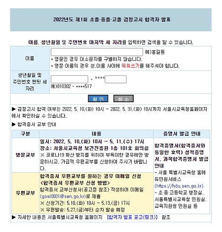 서울특별시교육청은 5월 10일 오전 2022년도 제1회 초·중·고등학교 졸업학력 검정고시 합격자를 서울특별시교육청 인터넷 홈페이지를 통해 발표했다.