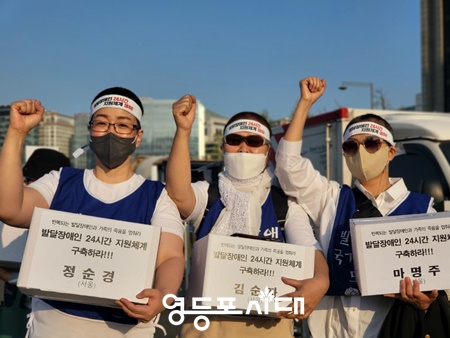 저는 영등포에서 40년 가까이 살고있는 21살 중복 발달장애를 가진 자녀와 고등학교에 재학 중인 비장애 자녀를 둔 정순경이라고 합니다. 지난 4월19일에 발달장애 가족은 한마음으로 청와대 앞에서 556명 삭발을 진행했습니다. 우리의 자녀들이 나중에 부모가 없더라도 지역사회에서 소외되지 않도록 영등포에서는 저와 김순자(김경주어머님)님, 마명주(황수진어머님)님 세분이 지역사회 24시간 지원체계 구축을 촉구하며 삭발에 동참했습니다. ”물이 천천히 차오른다고 해도 언젠가는 흘러넘칠 것이며 눈앞에 가시적인 변화가 보이지 않더라도 세상은 옳은 방향으로 나아가리라는 것을 믿습니다.혜원아 너를 위해, 네 동생을 위해 또다시 엄마가 큰 결심을 하는구나. 지금의 웃는 모습 즐거운 모습 그대로 장애가 걸림돌이 되지 않게 힘이 되어줄게. 사랑한다. 내 아이들아!“ ”제발 이번만큼은 우리의 간절한 마음이 허공에 흩어져 사라지지 않길 바라는 마음으로 삭발을 결심해본다. 내 사랑하는 딸 경주뿐만이 아니라 발달장애 자식을 둔 모든 부모님의 하나같은 마음으로 삭발하려 한다. 4월이 오면 투쟁하는 장애인의날이 아닌 장애인의 행복을 위해, 복지를 위해, 축복을 빌어주는 그런 날이 오길 바라며 삭발을 결심해 본다.“ ”이제 나이 25살. 앞으로의 날들이 힘들지언정 또 이렇게 살아낼 수 있었으면 좋겠어요. 발달장애 24시간 지원체계 마련되어서 혼자서는 생활하기 힘든 수진이도 지역에서 좀 더 의미 있게 살아가면 좋겠네요. 내 눈에만 이쁜 게 아니라 살아가면서 주변 이들에게도 이뻤으면 좋겠어요.“ "발달장애인 24시간 지원체계 구축하라“ 세 분의 삭발 결의문 중 일부입니다. 각기 다른 모습으로 살아가고 있지만, 자녀를 위해 애쓰는 마음과 모습은 하나였습니다. 556명의 삭발과 지도부 네 분의 무기한 단식농성이 15일간 이어졌으며 지역사회에서 24시간 지원체계 구축하라는 메시지는 부모님들은 물론 장애인복지계 나아가 국민들께도 정확한 메시지가 전달되었을 거라 믿으며, 인수위원회에서 발표한 국정과제의 조그마한 성과로 마무리되었습니다. 단식농성은 끝났지만, 또다시 시작될 것입니다. 발달장애인분들이 시혜적인 존재가 아닌 지역사회에서 의미 있는 삶을 살아갈 때까지 우리 부모는 멈출 수가 없습니다. 삭발에 동참하신 부모님들께 함께 더불어 살아가는 우리 지역사회가 되길 바라는 마음 보태줘서 고마웠고, 함께 해서 감사했습니다. 정순경 드림.