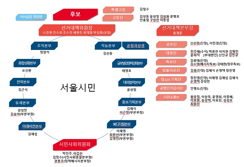 또 시민단체가 참여하는 ‘시민사회위원회’ 위원장은 박인주(前대통령실 사회통합수석비서관), 이갑산(범시민사회단체연합 회장)이 맡았다. 오세훈 캠프는 이번 선대위 특징은 “서울시민이 중심이 되고 퍼져나가는 방사형 구조로, 기존의 수직적인 선대위 체제가 아닌 누구나 의견을 제시할 수 있는 수평적이고 열린 의사소통구조에 역점을 뒀다”고 밝혔다. 서울시의원 비례대표 후보들이 시민들과 만나기 위한 시민소통TF, 정책특별위원회도 구성됐따. 조직도에서 후보 부분은 서울시장 후보뿐만 아니라 국민의힘 기초단체장, 광역‧기초의원 후보들이 모두 포함됐다. 선대위 관계자는 “모든 후보가 각자의 자리에서 최선을 다해 시민에게 다가가되, 하나의 후보처럼 한 마음 한뜻으로 준비된 서울 만들기에 총력을 다한다”는 의미라고 설명했다.