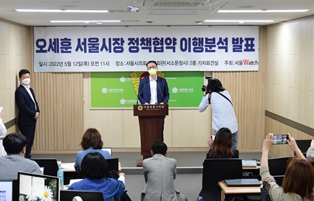 양민규 의원은 5월 12일 서울시의회 의원회관 2층 기자회견실에서 열린 경제정의실천시민연합(이하 경실련)과 공동 주최한 ‘오세훈 서울시장 정책협약 이행 분석 발표 기자회견’에서 “유권자의 시간이 3주 앞으로 다가왔다”라고 밝히고 “누구를 선택하느냐에 따라 지역 공동체의 미래가 달라지는 중요한 시간을 목전에 두고 있다”라며 이같이 강조했다. 경실련은 작년 4·7 서울시장 보궐선거 당시 오세훈 후보에게 서울시의 변화를 위한 5대 분야 17개 정책과제를 제안했다. 이 중 오 시장은 14개 과제에 동의한바, 이후 경실련은 전문 분야 평가위원회를 구성하고 과제별 실적에 대한 평가를 진행했다. 이날 기자회견은 오 시장의 공약 이행실적을 발표하는 자리로 진행됐다. 양민규 의원은 “경실련이 서울시로부터 전달받은 정책협약 이행실적 평가자료와 서울시 홈페이지 및 신문 기사 등을 참고 자료로 분석한 결과 오 시장이 ‘완전 이행’한 세부과제 수는 39개 중 단 3개(7.7%)에 그치는 것으로 나타났다”라며 “‘미이행’은 17개(43.5%)에 달했으며 ‘부분 이행’은 16개(41.0%)로 드러났다”라고 주장했다. 양 의원은 “풀뿌리 민주주의로 불리는 지방자치 발전을 위해 유권자들이 후보자의 능력과 정책공약을 꼼꼼하게 따져봐야 한다”라며 “실현가능한 공약을 제시한 유능한 일꾼을 가려낼 때 우리의 삶이 윤택해지고 지역발전 또한 견인할 수 있다”라고 강조했다. 양 의원은 “돌아오는 지방선거에서 ‘앞 수레의 엎어진 바퀴 자국을 보고 뒤 수레는 미리 경계해야 한다’는 ‘복거지계(覆車之戒)’의 교훈을 마음에 새겨야 한다”라며 “유권자 한표 한표는 경제적·사회적 파생에 따라 그 가치를 매길 수 없는 만큼 유권자의 소중한 권리를 꼭 지켜달라”라고 당부했다.