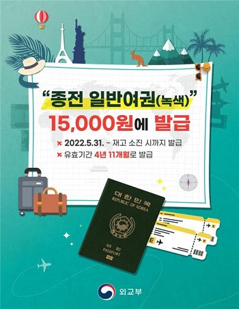 영등포구는 오는 5월 31일부터 재고 소진 시까지 종전의 녹색 일반여권을 현재 발급 중인 차세대 전자여권과 병행해 발급한다고 밝혔다. 종전 여권은 발급을 원하는 누구나 신청할 수 있으며 여권의 유효기간은 5년 미만(4년 11개월)이며, 신청자 요구에 따른 유효기간은 변경할 수 없다. 여권의 규격은 24면으로 발급수수료는 15,000원이다. 24면의 일반여권이 모두 소진되면 48면의 여권으로 발급될 예정이다. 잔여기간 부여 여권을 재발급할 때와 유효기간 1년 이내의 단수여권 발급 시에는 현재의 남색 차세대 전자여권으로만 발급받을 수 있다. 종전 여권의 발급을 희망하는 구민은 영등포구청 1층 민원여권과를 방문해, 발급신청서 작성 시 여권종류를 ‘일반’으로, 여권 기간은 ‘5년 미만’으로 체크해 제출하면 된다. 또한, 기존에 여권을 한 번이라도 발급받은 적 있는 만 18세 이상의 국민은 정부24 홈페이지를 통해 종전 일반여권을 발급받을 수 있다. 온라인 발급 신청은 6월 3일부터 할 수 있다.
