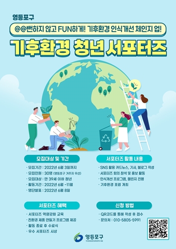 영등포구가 ‘2022 영등포 청년 기후환경 인식 체인지업(Change-UP)’ 사업을 추진과 함께 함께할 청년 서포터즈를 모집한다.