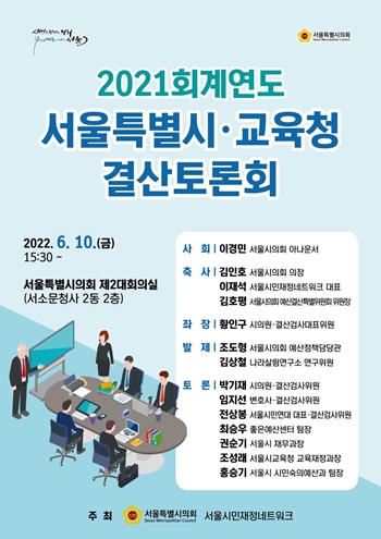 서울특별시의회는 6월 10일(금) 오후 의원회관 제2대회의실에서 서울시민재정네트워크와 공동으로 ‘2021회계연도 서울특별시․교육청 결산토론회’를 개최한다.