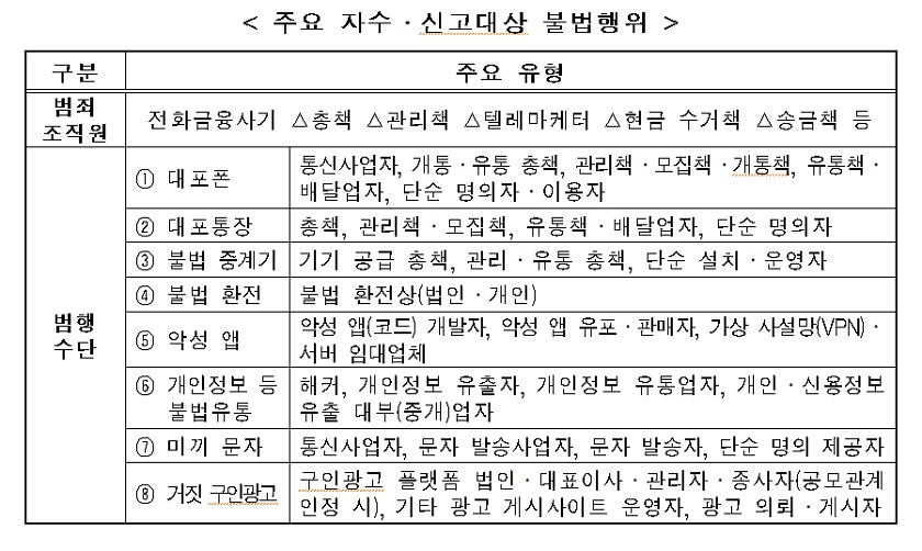 “전화금융사기 모든 범죄에 대해 무관용 엄중 처벌하게 될 것” 경찰청 국가수사본부는 전화금융사기 총책·중간관리책 등 범죄조직의 상선부터 현금 수거책·중계기 관리책 등 하부조직원까지 전체를 대상으로 6월 8일부터 8월 7일까지 2개월간 ‘전화금융사기 특별 자수·신고 기간’을 운영한다.