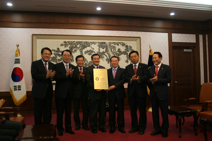선플국민운동본부(이사장 민병철)는 지난 13일 오후 서울 여의도 국회의장실에서 국회 선플정치선언문과 서명 국회의원 293명의 명단이 새겨진 동판 전달식을 가졌다.