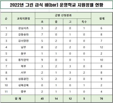 서울시교육청학교보건진흥원(아래 학교보건진흥원)은 교육환경 내실화 지원의 하나로 채식 선택제 운영이 가능한 그린급식 바[bar] 설치를 추진한다.