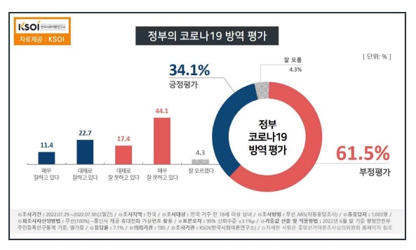 TBS-KSOI 7월 29~30일 공동 조사 결과 이같이 나타났다. 지난 2주간 32%대에서 보합세를 보였던 윤석열 대통령의 긍정 평가는 3.3%p 하락해 28.9%로 떨어졌다. 지속해서 늘던 부정 평가는 직전 주보다 4.0%p 증가해 최고치인 68.5%를 기록했다. 정당 지지율은 더불어민주당 43.5%(1.6%p↑), 국민의힘 33.8%(1.7%p↑)로 민주당이 2주 연속 오차범위 밖에서 앞섰다. 윤석열 대통령의 “내부 총질이나 하던 당 대표” 문자 메시지 공개와 관련, 이준석 대표 징계에 대통령의 의중도 작용한 게 아니냐는 주장에 대해서 전체 응답자의 68.8%가 ‘공감한다’라고 답했다. (‘비공감’ 25.5%, ‘잘 모름’5.7%)