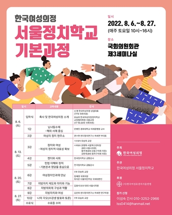 한국여성의정이 주최, 한국여성의정 서울정치학교 주관, 사)한국여성유권자서울연맹의 후원으로 8월 6일 입학식을 시작으로 8월 27일 10강을 종료한 후 수료증 수여식이 개최된다. 프로그램을 소개하면 먼저 8월 6일 안병진 경희대학교 미래문명원 교수의 해외 사례를 중심으로 ‘남녀동수제’에 관한 강의를 시작으로 여성의 정치 현주소(2강), 8월 13일에는 3강으로 유승희 교장의 기조 발제에 이어 윤명화 서울혁신센터장, 황주영(전 구의원), 강한옥(전 구의원)의 정치와 여성(부제, 여성의 정치적 대표성 확보)에 대한 사례를 발표한다. 계속해서 전국정치학교 공통 강사의 젠더와 사회(4강), 헌법 이해와 정치(5강)를 마지막으로 13일 강의는 종료된다. 8월 20일에는 6강, 7강, 8강이 각각 여성정치인의 만남, 지방자치제도의 의미와 기능, 지방의회 구성과 역할 등이 진행된다. 마지막 날인 8월 27일에는 김용석 시의원과 김은희 젠더정치연구소 여세연 연구위원이 나서 지방자치와 여성(9강), 유승희 교장이 진행하는 나의 각오(10강)가 진행된다. 이후 수료증 수여식을 끝으로 한국여성의정 서울정치학교 기본과정을 모두 마친다. 수강 신청을 받고 있는 이섬숙 간사는 8월 2일 오전 본지와의 통화에서 “강의료는 전액 무료이며 정치에 관심이 있거나 정치를 알고 싶고 바꾸고 싶은 여성이라면 누구나 신청할 수 있다”라며 자신의 연락처(010-3252-2966)를 남겼다.