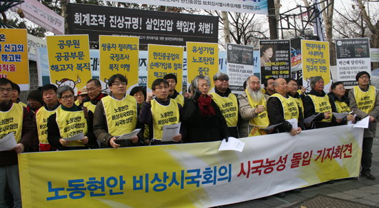 18일 오후, 대한문 농성장 앞에서 ‘노동현안 비상시국회의’ 농성·시국대회 투쟁 선포 기자회견이 열렸다. ‘노동현안 비상시국회의’는 이번 기자회견을 노동의 가치를 짓밟고 죽어가는 노동자를 외면하는 박근혜 정부를 이대로는 맞이할 수 없다는 입장과 함께 오는 23일 분노의 대규모 범국민대회를 개최하겠다고 밝혔다.