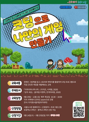 서울도서관은 초등학교 5학년부터 중학교 3학년을 대상으로 매주 목요일 10회에 걸쳐 그림책을 활용하여 수강생이 직접 코딩으로 게임 프로그램을 만들어보는 강좌를 온라인으로 운영한다.