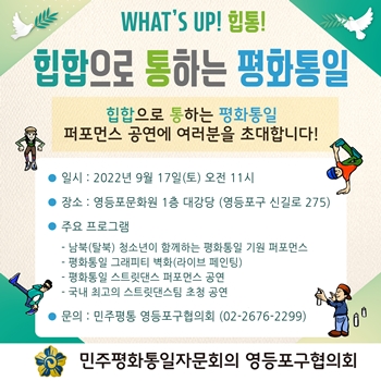 민주평화통일자문회의 영등포구협의회는 9월 17일 영등포문화원 1층 대강당에서 “WHAT’S UP!’힙통! 힙합으로 통하는 평화통일” 퍼포먼스 공연을 개최한다.