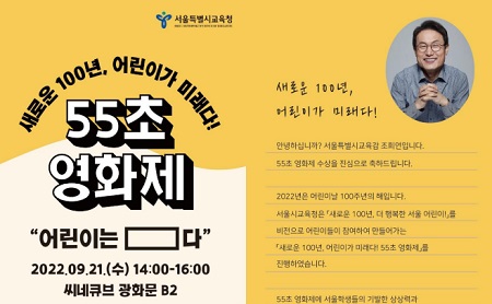 서울특별시교육청(교육감 조희연)은 9월 21일(수) 오후 2시 광화문 씨네큐브에서 2022년 어린이날 100주년의 해를 기념하여「새로운 100년, 어린이가 미래다! 55초 영화제」(아래 55초 영화제)의 시상식 및 시사회를 개최한다. 55초 영화제에 출품된 총 120여 편의 영화 작품 중 초등학생 부문(19편)과 성인 부문(3편)으로 나누어서 수상작을 선정하여, 시상식 당일 최종 결과를 발표한다. 55초 영화제 시상식 및 시사회는 이무영 영화감독과 유나 배우의 사회로 우수 작품 시상, 수상작 하이라이트 상영, 브릴란떼 어린이 합창단의 축하공연 등으로 진행될 예정이다. 55초 영화제 수상 예정작은 2022년 9월 5일(월)부터 서울특별시교육청의 학교예술교육 유튜브 채널인 ’예술락낙‘과 55초 영화제 공식 홈페이지에서 관람할 수 있다. 조희연 서울시교육감은 “55초 영화제는 어린이가 참여하여 만들어가는 영화제로, 서울 어린이 한 명 한 명이 빛나는 서울교육을 실현하는데 이바지하였으며, 서울시교육청은 학생들이 일상에서 예술을 즐기고 누리며 더불어 살아갈 수 있도록 예술교육의 일상화를 적극적으로 지원하겠다.”라고 밝혔다.