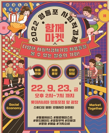 이번에 운영되는 소셜 팝업스토어’와 ‘사회적경제 함께마켓’은 제품 리브랜딩으로, 사회적경제에 대한 친밀감을 제고하고 사회적 가치를 주민들과 공유하려는 취지로 마련됐다. 이번 팝업스토어는 오는 9월 26일부터 10월 2일까지 여의도에 있는 더현대서울 지하 1층 대행사장에서 열린다. 지역 내 사회적경제 기업 7개소가 참여해 ▲천연 소재 패션가방 ▲반려동물 용품 ▲친환경 비누 ▲유기농 쿠키 ▲사과즙 등 다양한 제품들을 선보인다. 영등포구는 이번 행사를 통해 사회적경제 기업의 인지도를 높이고 신규 고객 확보 및 매출 증대에도 기여할 것으로 기대하고 있다. 아울러, 오는 23일 14시부터 19시까지 롯데시네마 영등포점 앞 광장에서 ‘사회적경제 함께마켓’이 개최된다. 관내 사회적기업, 사회적협동조합, 마을기업, 자활기업 등 14개 업체가 참여해 직접 생산한 ▲친환경제품 ▲업사이클링제품 ▲목공제품 ▲수공예품 ▲먹거리 등을 판매한다. 행사 당일 18시까지는 버려지는 커피 찌꺼기를 활용한 그림그리기, 단추를 이용한 브로치 만들기, 자투리 나무 장난감 만들기 등 방문객들의 즐거움을 더하는 체험프로그램도 운영된다. 또한, 지역주민의 일상 속 건강 관리를 위해 ‘건강지킴이 양성과정’을 이수한 교육생들이 혈압과 인바디를 무료로 측정해 준다. 한편, 사회적경제 거점 공간인 ‘스튜디오 영원’에서 인생사진 이벤트도 진행된다. 스튜디오 영원에 마련된 카메라, 컬러스크린, 촬영 소품을 활용해 나만의 인생 사진을 촬영할 수 있다. 다음 달 21일에도 동일한 장소에서 함께마켓이 개최될 예정이며, 기타 자세한 사항은 사회적경제과 또는 함께마켓 운영팀으로 문의하면 된다. 김용술 사회적경제과장은 “이번 행사를 통해 지역 내 사회적경제기업이 경영난을 해소하고 지속적인 성장을 이루는 데 보탬이 되길 바란다”며 “앞으로도 포포그레를 활용한 다양한 제품 및 서비스 개발에 힘써 지역사회에 가치소비가 뿌리내릴 수 있도록 더욱 노력하겠다”고 전했다.