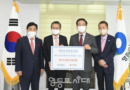 여의도순복음교회 윤광현 부목사(사진 오른쪽에서 두 번째)와 탁세진 장로는 9월 27일 오후 폭우피해를 본 지역 내 주민들을 위해 사용해 달라는 당부와 함께 최호권 영등포구청장(사진 왼쪽에서 두 번째)에게 성금 1천만 원을 전달했다.
