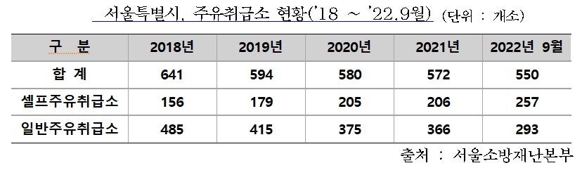 서울시 소방재난본부에 따르면 2018년 156개소이던 셀프주유취급소는 올해 9월 말 기준 257개로 늘어나 해당 기간 중 64.7%가 증가한 것으로 나타났다. 반면 일반주유취급소는 오히려 192개소(39.6%↓)가 감소했다.
