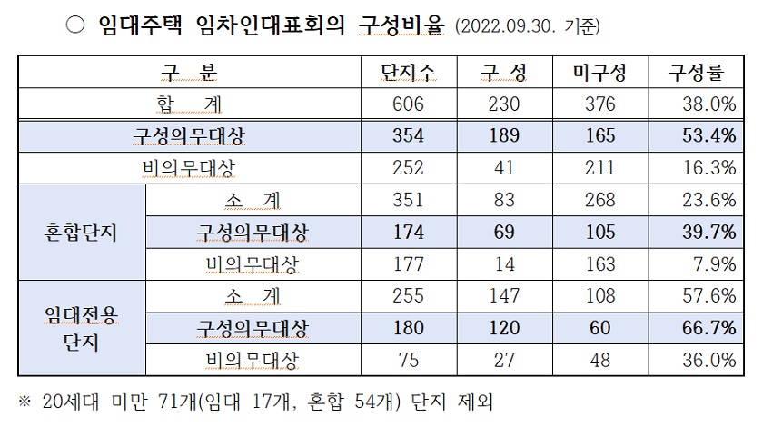 서울시의회 주택공간위원회 박승진 부위원장이 SH공사로부터 제출받은 자료를 분석한 결과 이같이 나타났다. 특히 혼합단지의 임차인 차별 민원이 여전하지만, 임차인들의 목소리를 대변할 임차인대표회의 구성은 저조한 것으로 나타났다. 임차인대표회의가 사실상 입주자대표회의 역할을 하는 임대전용단지는 임차인대표회의 구성률이 66.7%에 달했지만 혼합단지는 39.7%에 그쳤다.