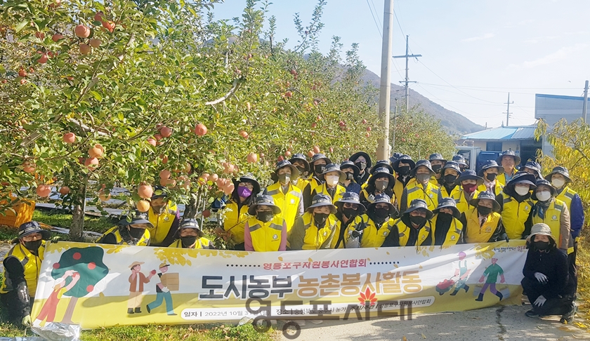 영등포구 자원봉사연합회 10월 31일 오전 충청북도 충주시 농가를 방문해 도시농부 농촌봉사활동으로 사과 수확을 진행했다.