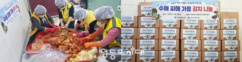직접 김장해 24가정 방문, 일일이 전달 영등포구 도림동 자원봉사연합회(회장 설형순)는 11월 2일 오전 설형순 회장 집에서 김치 120kg을 담가 올여름 집중호우로 피해를 본 가정과 소외계층 등 24가정에 전달했다.
