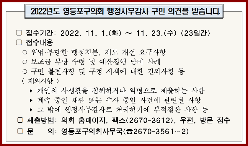 기타 문의 사항은 영등포구의회 사무국(02-2670-3561~2)으로 전화하면 된다. 제출된 의견에 대해서는 행정사무 감사 종료 후 제출한 구민에게 직접 그 결과를 회신할 예정이다. 정선희 의장은 “영등포구의회 의원들이 구민 여러분의 든든한 버팀목이자 진솔한 대변자로서 ‘열린 의정, 정책 의정, 바른 의정’을 실현할 수 있도록 구민 분들의 많은 관심과 적극적인 참여 부탁드린다”라고 말했다. 한편, 영등포구의회는 11월 21일부터 12월 21일까지 31일에 걸친 ‘제241회 영등포구의회 제2차 정례회’를 개회할 예정이며, 11월 28일부터 12월 5일까지 8일간 행정사무 감사를 시행한다. 세간의 녹취록으로 떠도는 B 구의원의 성비위 의혹은 익명과 실명을 떠나 개인의 사생활로 행정사무 감사 대상이 아니므로 행정 감사 구민 의견에 포함이 되지 않을 것으로 보인다. 다만 윤리위원회 회부는 사실 여부에 따라 결정될 수 있을 것으로 판단된다.