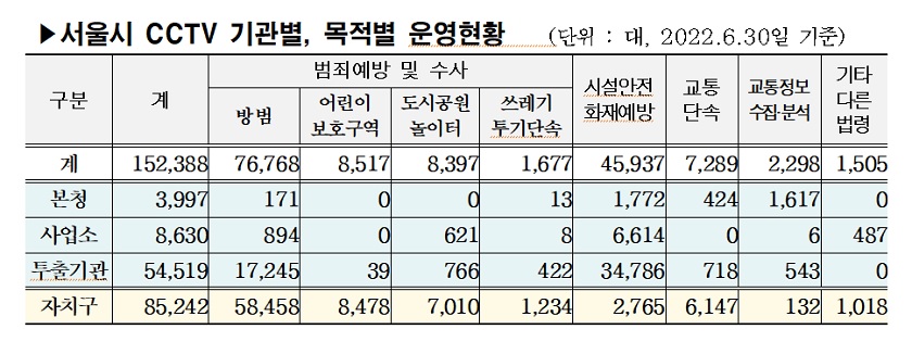 서울시가 자치구의 CCTV 영상정보를 실시간 연계하는 스마트시티 플랫폼을 구축 중이다. 올해까지 17개 자치구 연계를 완료할 예정이고 나머지 8개 자치구는 내년에 연계해 25개 자치구 모두 서울시 CCTV 안전센터에 연결한다. 자치구와 서울시의 CCTV 영상정보를 112, 119 상황실과 연계함으로써 각종 사고 발생 시 시민 안전을 위한 신속 대응 골든타임을 확보하는 ‘인공지능(AI) CCTV 기반 그물망 스마트 안전 도시 구현’은 오세훈 시장의 제39대 공약이기도 하다. 디지털정책관 제출 자료에 의하면, 2022년 6월 기준 서울시 CCTV는 서울시 운영 67,146대, 자치구 운영 85,242대 등 총 152,388대다. 목적별로는 방범이 50.4%인 76,768대, 시설 안전·화재 예방이 30.1%인 45,937대로 대부분을 차지한다. 어린이 보호구역 8,517대, 도시공원·놀이터 8,397대, 교통단속 7,289대가 그 뒤를 따르고 있다. 자치구별로는 강남구가 6,871대로 가장 많고 그다음으로 관악구 5,342대, 성북구 4,611대, 구로구 4,608대 순이다. CCTV가 적게 설치된 자치구는 종로구 1,855대, 도봉구 2,091대, 동작구 2,331대 순이다. 용산구도 2,611대로 적은 편에 속한다.