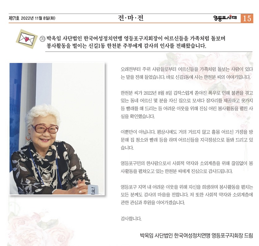오래전부터 주위 사람들로부터 어르신들을 가족처럼 돌보는 사람이 있다는 말을 전해 들었습니다. 바로 신길1동에 사는 한천분 씨의 이야기입니다. 한천분 씨는 2022년 8월 8일 갑작스럽게 쏟아진 폭우로 인해 불편을 겪고 있는 동네 어르신 몇 분을 자신 집으로 모셔다 잠자리를 제공하고 옷가지 등 빨래를 해 드리는 등 어려운 이웃을 위해 진심 어린 봉사활동을 펼친 사실을 확인했습니다. 이뿐만이 아닙니다. 평상시에도 거의 거르지 않고 홀몸 어르신 가정을 방문해 집 청소와 빨래 등을 하며 어르신들을 지극정성으로 돌봐 드리고 있습니다. 영등포구민의 한사람으로서 사회적 약자와 소외계층을 위해 끊임없이 봉사활동을 펼쳐오고 있는 한천분 씨에게 진심으로 감사드립니다. 영등포구 지역 내 어려운 이웃을 위해 자신을 희생하며 봉사활동을 펼치는 모든 분께도 감사의 마음을 전합니다. 저 또한 사회적 약자와 소외계층에 관한 관심과 후원을 이어가겠습니다. 감사합니다. 박옥임 사단법인 한국여성정치연맹 영등포구지회장 드림