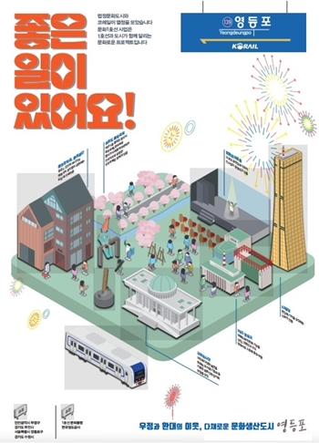 영등포구가 1호선에 있는 법정 문화도시인 부평, 부천, 영등포, 수원의 문화재단 4곳과 MOU를 맺고 한국철도공사(KORAIL)와 합심해, 특색 있는 문화도시 사업을 본격적으로 추진한다고 21일 밝혔다. ‘문화 1호선’ 프로젝트는 “좋은 일이 있어요”를 슬로건으로 영등포를 비롯한 부천, 부평, 수원이 함께 뜻을 모아 추진하는 문화협력 사업이다. 4곳의 문화재단은 1호선을 70~80년대 산업화 시대의 역사적 공유를 넘어서는 새로운 문화공간으로 재창조하는 데 협력한다. 영등포구도 ‘문화 1호선’의 가장 핵심 사업인 각 문화도시를 홍보하는 수도권 전철 플랫폼 안내 방송에 적극적으로 동참한다. 전문 카피라이터 정철이 제작에 참여해 작업의 완성도를 높였으며, 녹음에는 KBS 기상캐스터 이설아가 맡아 밝은 에너지를 전달할 예정이다. 방송 멘트는 “문화도시 영등포에선 당신도 문화 시민입니다. 영등포는 1년 365일 문화를 만듭니다”로 최종 확정됐다. 방송은 11월 18일부터 12월 31일까지 코레일에서 운행하는 수도권 전철과 주요 역의 맞이방에서 송출된다. 아울러, 도시 특성을 반영한 인포그래픽 등을 활용한 홍보물 배포를 통해 문화도시 홍보를 한층 강화할 예정이다. 문화적 특징을 시각적 정보를 통해 한눈에 알아볼 수 있으며 다양한 문화공간, 행사 등에 대한 정보를 제공한다. 또한, 지하철 내‧외부, 플랫폼 등을 활용해 ‘지하철 1호선, 풍경을 그리다’란 ‘시민 참여 프로그램’도 운영된다. 지하철을 타면서 행복했던 추억을 주제로 스케치를 하는 문화 프로그램으로, 김효찬 드로잉 작가가 강의실‧ 지하철 등에서 수업을 진행한다. 향후, 드로잉 작품들은 온라인 미디어 전시 형태로 게시될 예정이다. 김형성 문화체육과장은 “영등포의 다채로운 문화와 역사를 많은 분과 공유하며 특색있는 문화도시 브랜드를 창조해 나가는 데 힘쓰겠다”라며 많은 관심을 당부했다.