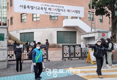 2023학년도 대학수학능력시험(아래 수능 시험)이 11월 17일 오전 8시 40분부터 전국 84개 시험지구 1천375개 시험장 25개 병원에서 일제히 시작됐다. 한파는 없었지만, 일교차가 10도~20도로 매우 큰 가운데 치러진 올해 수능시험 응시자는 50만 8,030명으로 2022학년도 수능생과 비교하면 1,791명(0.4%) 감소한 것으로 집계됐다. 수험생 응시 분포를 살펴보면 재학생은 35만 239명(68.9%)으로 1만 471명이 감소했으며 재수생과 졸업생은 14만 2,303명(28.0%)으로 7,469명 증가했다. 검정고시 등 기타 지원자는 1만 5,488명(3.1%)으로 1,211명 늘어난 것으로 나타났다. 수험생들은 지난해와 마찬가지로 올해 수능에도 문·이과 구분 없이 국어와 수학 영역에서 공통과목을 응시하고 선택과목 중 1개를 골라 시험을 치렀다. 이번 시험도 확진 수험생이 별도 시험장이나 병원에서 응시했다. 현재 코로나19에 확진된 수험생은 총 2,317명이다. (16일 기준) 이는 10일부터 15일까지 확진된 수험생으로, 10일 확진된 500명은 수능 당일 격리가 해제돼 일반 시험장에서 시험을 치렀다. 한편 서울시에서는 11개 시험지구 248개 시험장(일반 시험장 226교, 별도 시험장 22교), 병원 시험장(1개소)소에 106,765명이 수능시험에 응시했다. 영등포구 지역 내 수능시험 응시생은 총 2,734명으로 영등포여고, 여의도여고, 관악고, 선유고, 대영고, 영신고(일반 시험장), 여의도고, 장훈고(코로나19 자가격리자를 위한 별도 시험장), 여의도중(특별시험장) 등 9개 학교에서 수능시험에 응시했다.