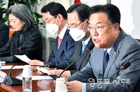 정진석 비대위원장은 “지난 금요일 서울 신촌에서, 토요일에는 인천 서구에서 비극적인 소식이 전해졌다”라며 이같이 강조했다. 정 비대위원장은 “새해 정부 예산안에는 복지 망 확충을 위한 예산들이 다수 편성돼 있다. 이 예산안이 부족하지는 않은지, 더 보태야 할 것은 없는지, 여야가 밤을 새워서 토론해야 한다. 예산안 처리 법정시한이 1주일도 채 남지 않았다”라며 새해 예산안을 법정시한 안에 처리해야 한다는 점을 거듭 강조했다. 주호영 원내대표는 민주당이 이상민 행정안전부 장관을 오늘까지 파면하라고 요구하고 있는 것에 대해 “지난주에 예산안 처리 이후 국정조사를 하기로 합의했다”라며 “국정조사 결론이 나기도 전에 요구하는 것인데 그렇다면 국정조사를 할 이유가 없는 것이다”라고 반박했다. 주호영 원내대표는 “이번 주 12월 2일까지는 헌법과 국회법이 정한 내년도 예산안 처리 법정시한이다”라며 “이 시한 내에 예산을 처리하기에도 아직 의견 차이가 너무 크고 준비가 되지 않았는데, 또 다른 정쟁거리를 만들고 무리한 요구를 하는 거 같다”라고 비판했다. 주호영 원내대표는 “민주당은 며칠 지나지 않은 합의 정신 ‘예산안 처리 이후에 국정조사를 하고 국정조사 결과에 따라서 책임을 묻고 재발 방지대책을 세운다’는 합의 정신을 존중하길 요청한다”라고 말했다. 성일종 정책위의장은 화물연대 운송거부와 관련 “경제충격이 현실화가 되고 중소소상공인들인 레미콘 사업자의 피해는 물론이고 일용직 근로자들의 생계마저 위협받고 있다”라며 “국가 경제의 혈관을 동맥경화 시켜 민주노총의 정치적 목적을 이루려는 불손한 파업을 더 이상 좌시할 수 없다”라고 목소리를 높였다. 성 정책위의장은 “화물연대 총파업의 목표는 분명하다”라며 “정부와 국민들의 단호한 대응만이 화물연대의 불법행위를 멈출 수 있다”라고 주장했다.