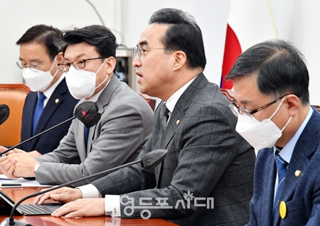 민주당 박홍근 원내대표(사진 오른쪽에서 두 번째)는 12월 6일 국회에서 열린 원내대책회의에서 “초부자 감세 철회, 위법 시행령과 낭비성 예산 감액, 따뜻한 민생예산 확충이라는 대원칙에 따라 협상에 임할 것이다”라고 밝혀 기존 입장에 변화가 없음을 분명히 했다.