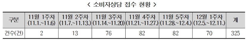 환불·카드 결제취소는 이뤄지지 않아, 피해 호소 11월부터 12월 11까지 ‘서울시 전자상거래센터’와 ‘1372소비자상담센터’에 접수된 피해상담은 총 325건. 모두 배송지연과 환불지연인 것으로 나타났다.